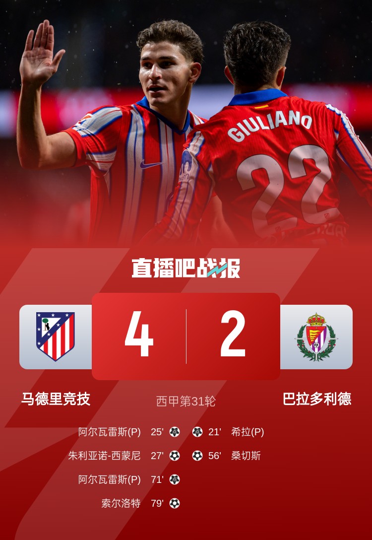 馬競4-2逆轉(zhuǎn)巴拉多利德,阿爾瓦雷斯兩球,朱利亞諾-西蒙尼和索爾洛特破門。