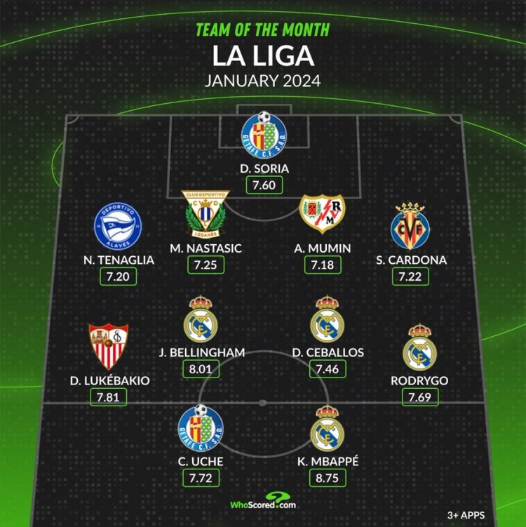 2月4日訊 whoscored統(tǒng)計(jì)了西甲1月的評(píng)分最佳陣,姆巴佩、貝林厄姆領(lǐng)銜。