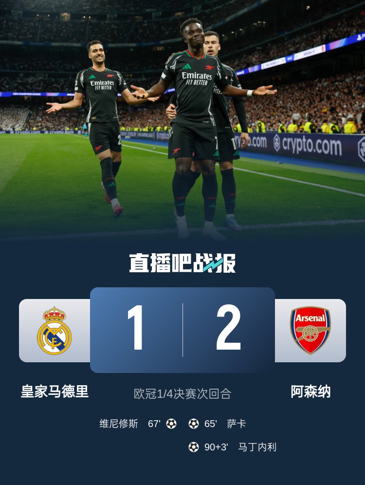 歐冠1/4決賽次回合,阿森納客場2-1皇馬,總比分5-1晉級四強,薩卡、馬丁內利進球。