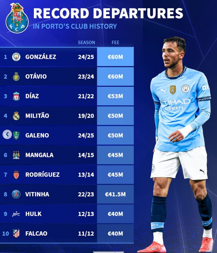 2月4日訊 曼城已經(jīng)官宣簽下波爾圖中場尼科-岡薩雷斯,《轉(zhuǎn)會市場》也統(tǒng)計了波爾圖隊史賣人最貴榜。