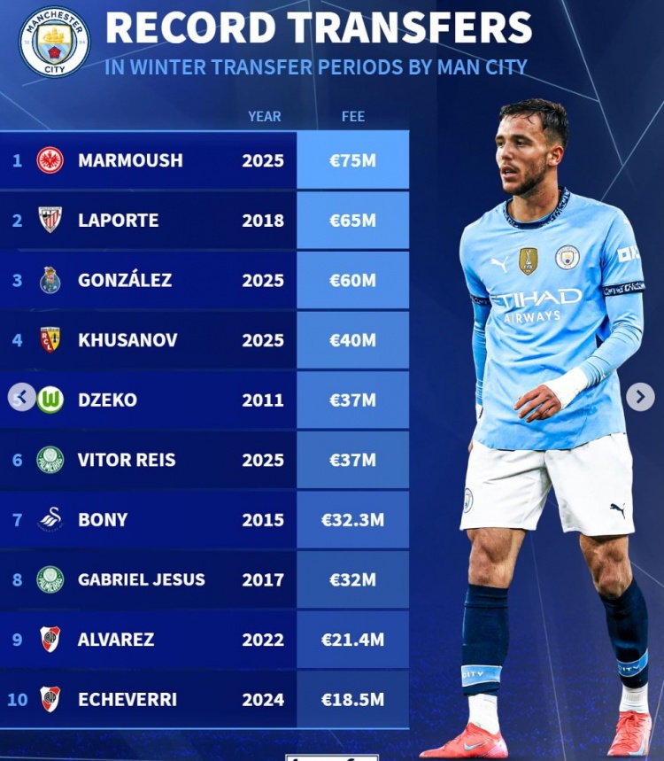 2月4日訊 曼城已經(jīng)官宣簽下波爾圖中場尼科-岡薩雷斯,《轉(zhuǎn)會市場》也統(tǒng)計(jì)了曼城隊(duì)史冬窗引援榜情況。