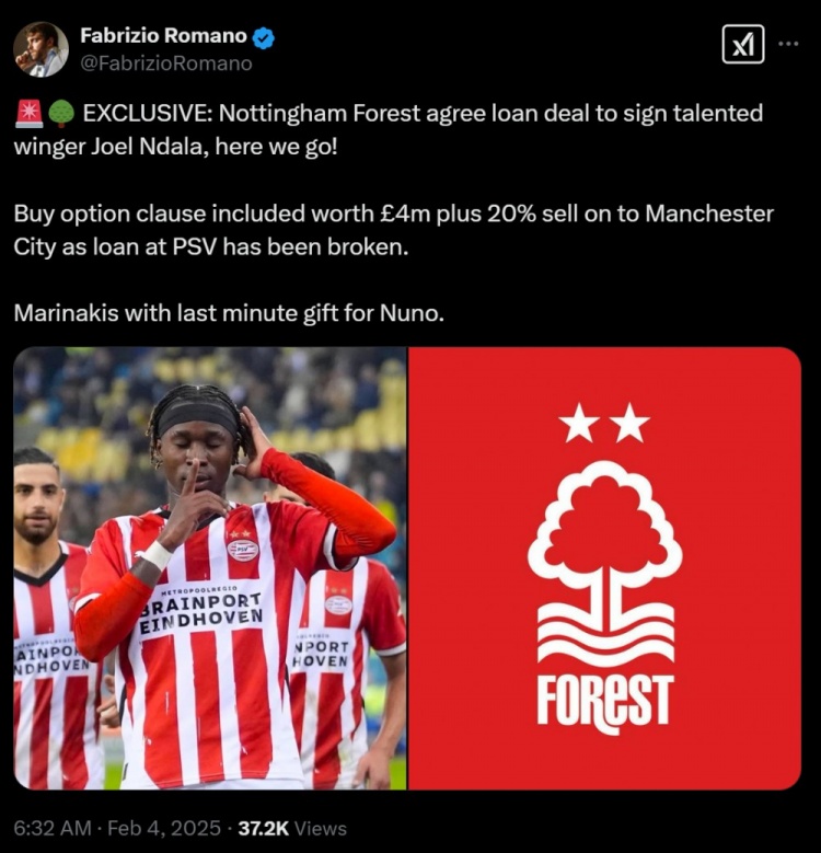 2月4日訊 羅馬諾用標志性的here we go 確認,森林將租借18歲曼城邊鋒恩達拉,球員在埃因霍溫的租期提前結束。