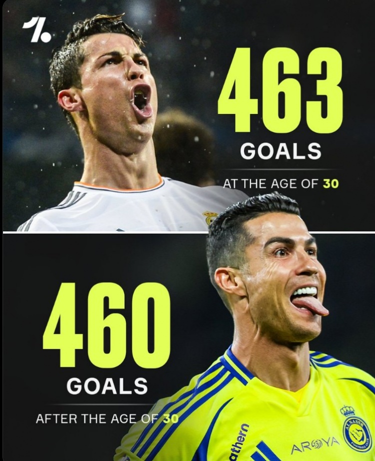 據(jù)統(tǒng)計,C羅在30歲之后各項賽事已經(jīng)打進(jìn)460粒進(jìn)球,此數(shù)據(jù)和他在30歲以及之前的進(jìn)球數(shù)僅差3球。