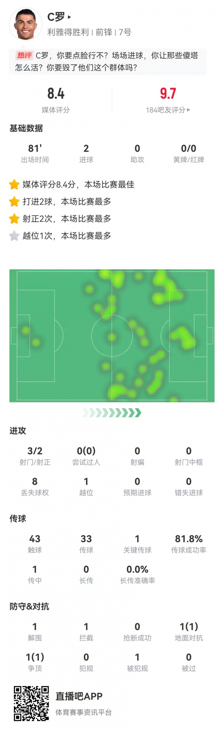 C羅本場(chǎng)數(shù)據(jù):3射2正進(jìn)2球+1關(guān)鍵傳球,獲評(píng)8.4分全場(chǎng)最高