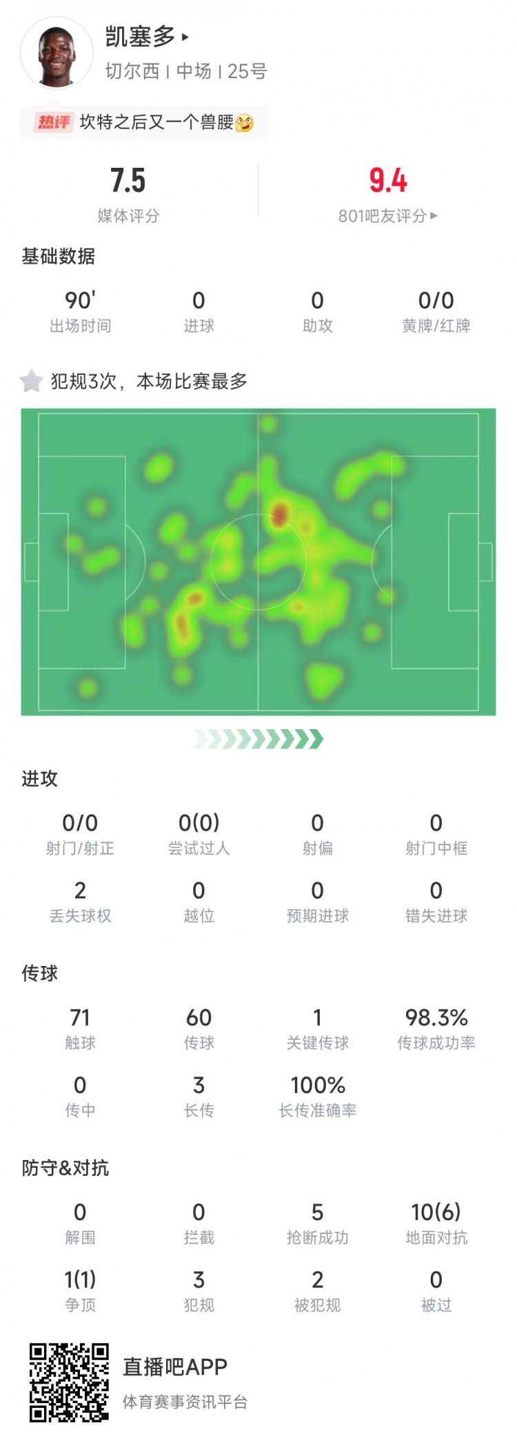 凱塞多當選本場比賽最佳球員,切爾西官方社媒曬出他領獎的照片,配文:“這個人的表現(xiàn)太棒了?!?/p>