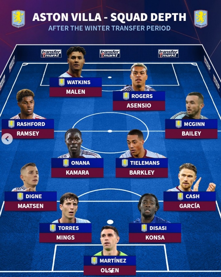 2月4日訊 維拉在冬窗引進拉什福德、迪薩西、阿森西奧等多人,德轉(zhuǎn)也盤點了維拉目前可以排出的首發(fā)以及各位置替補人選,具體如下: