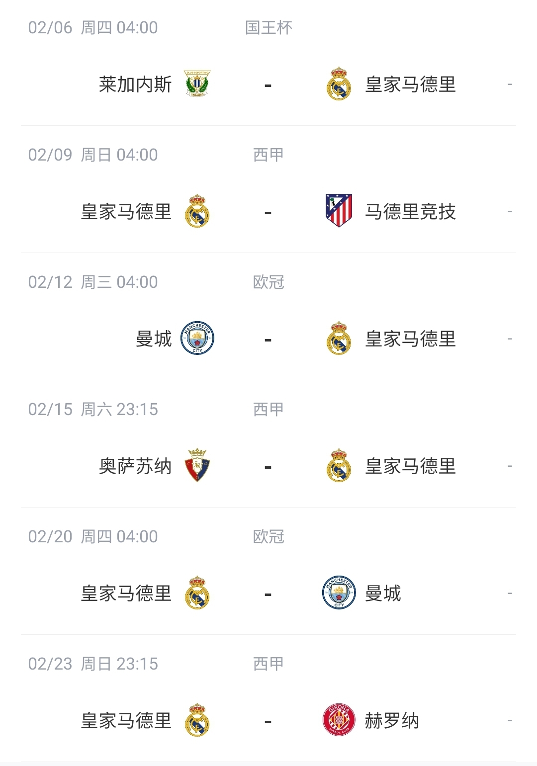 2月12日,皇馬在歐冠淘汰賽附加賽首回合客場對陣曼城