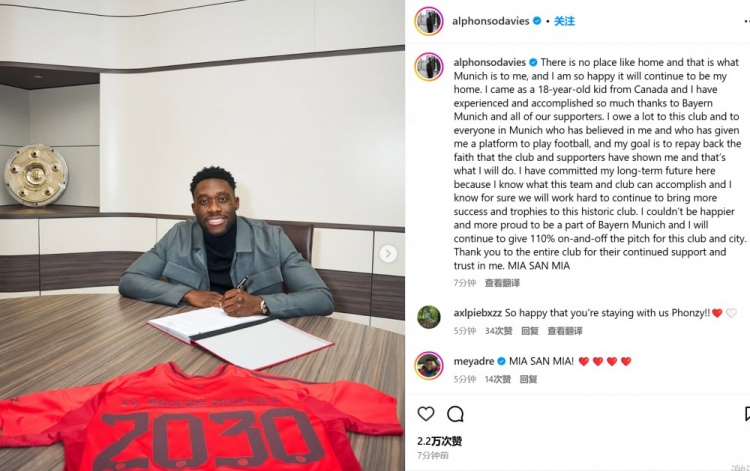 2月5日訊 拜仁已經(jīng)官宣續(xù)約戴維斯至2030年,后者也通過社媒曬出簽約照紀念。
