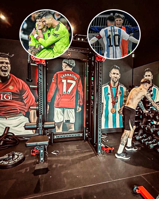 雙料隊(duì)友!加納喬個(gè)人健身房?jī)?nèi)裝飾了梅西和C羅的大幅海報(bào)