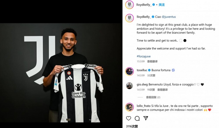 凱利社媒曬加盟照:很高興和尤文簽約,這里有著非凡的雄心和歷史