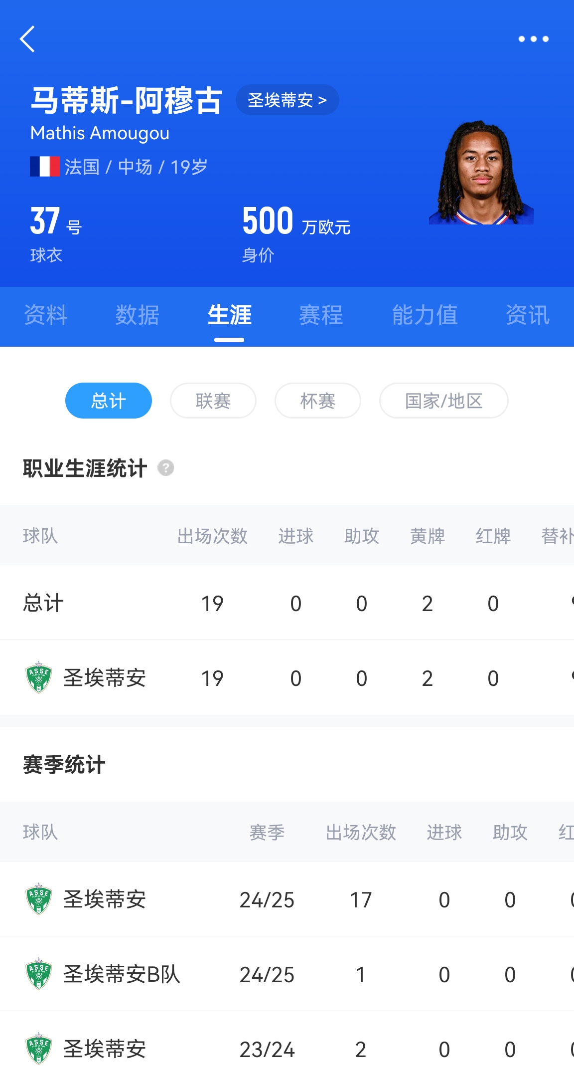 阿穆古是圣埃蒂安青訓(xùn)出身,上賽季完成一線隊首秀,截至目前共為圣埃蒂安一隊出場19次。