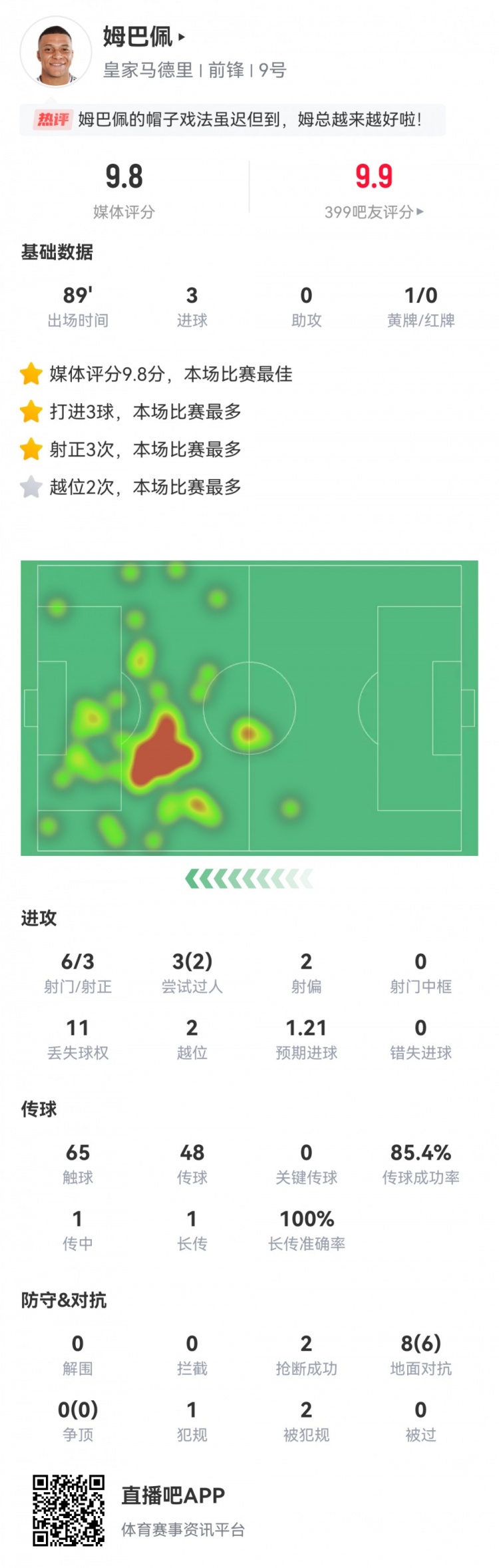 皇馬首帽!姆巴佩數(shù)據(jù):6射3正3粒進(jìn)球,2次過人,全場(chǎng)最高9.8分