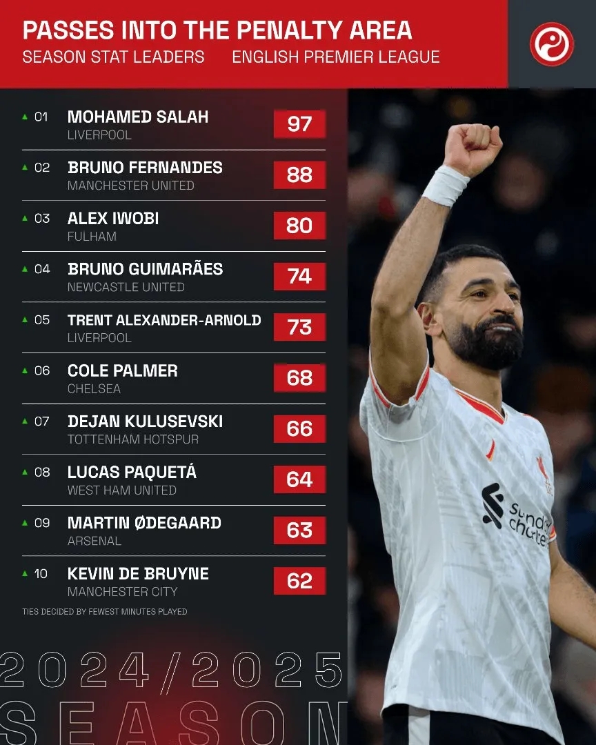 英超傳球進(jìn)禁區(qū)榜:薩拉赫壓B費(fèi)居首,帕爾默、厄德高、丁丁在列
