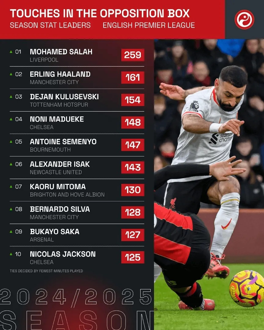 英超對方禁區(qū)內(nèi)觸球榜:薩拉赫259次斷崖領(lǐng)跑,哈蘭德161次第二