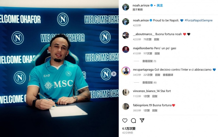 奧卡福曬出自己和那不勒斯的簽約照,并表示:“很自豪能夠來到那不勒斯?!备鶕?jù)此前消息,那不勒斯向米蘭支付150萬歐元租借奧卡福,選擇買斷費2350萬歐。