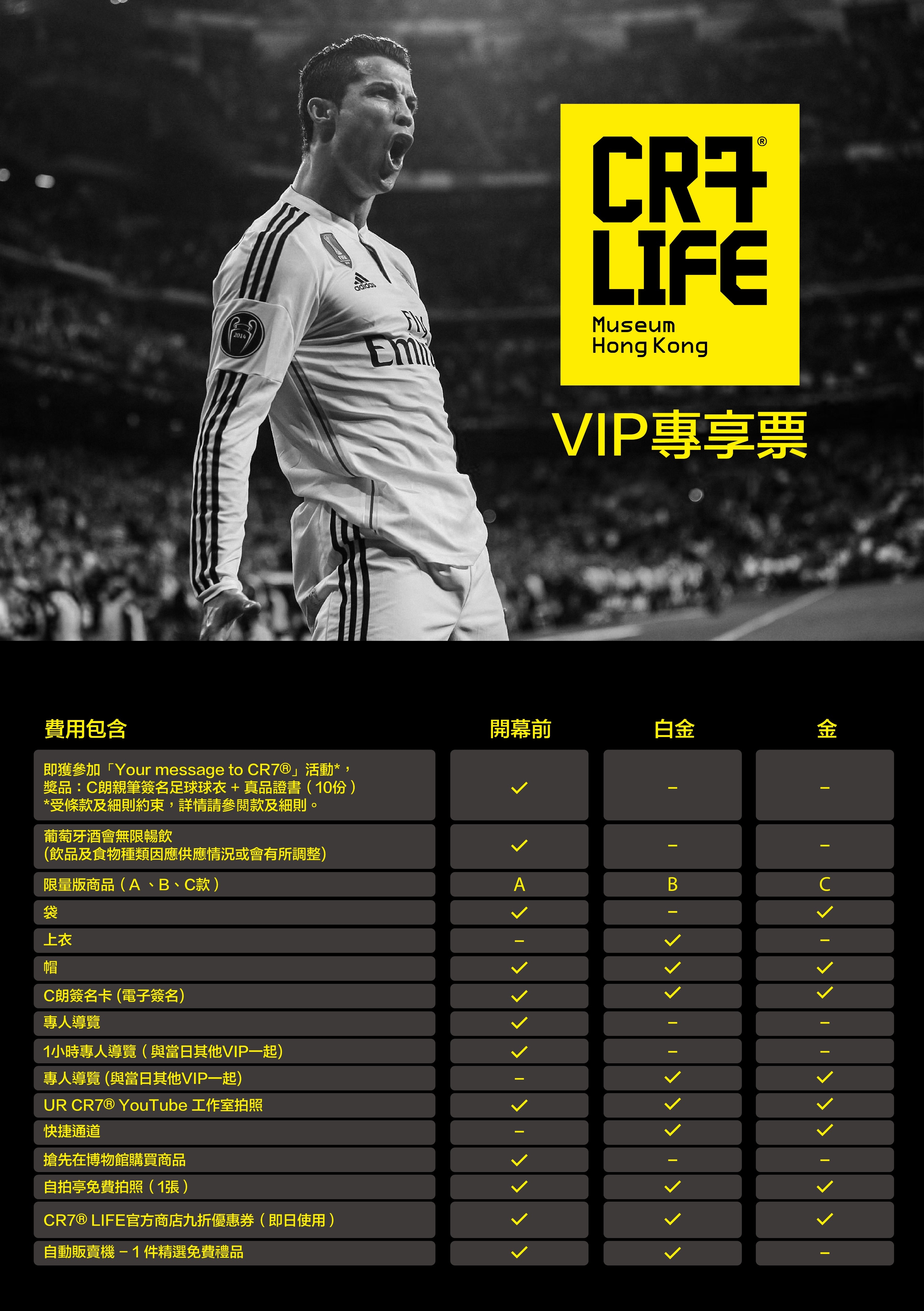 “CR7?生活博物館”門票今日(5日)正式開售,最貴的VIP門票售價4000港幣(折合人民幣3687.88元),可在博物館開幕前一至兩日進(jìn)場參觀,及參加抽獎,贏取C羅簽名T恤;成人票價180港幣,老人及兒童150港幣。