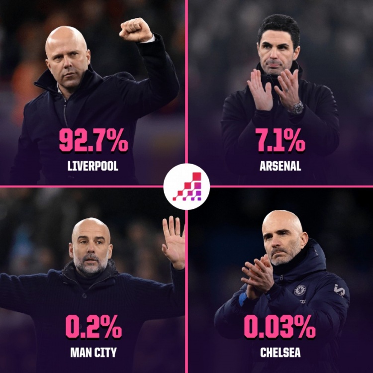 - Opta英超奪冠概率:利物浦92.7%,阿森納7.1%,曼城0.2%