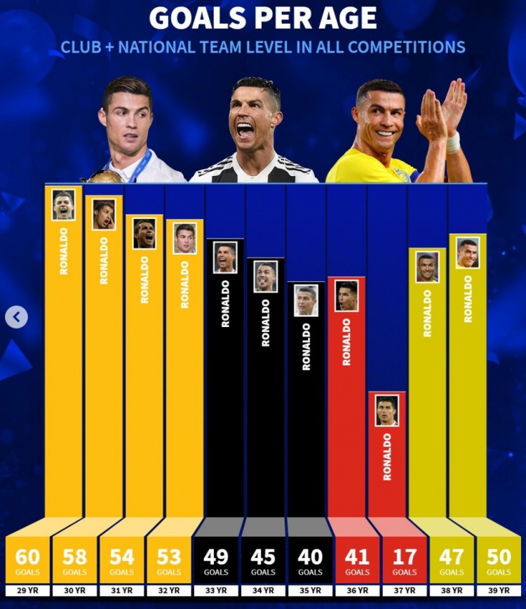 德轉(zhuǎn)列C羅生涯進(jìn)球情況:17歲打進(jìn)5球,27歲67球最多,39歲50球