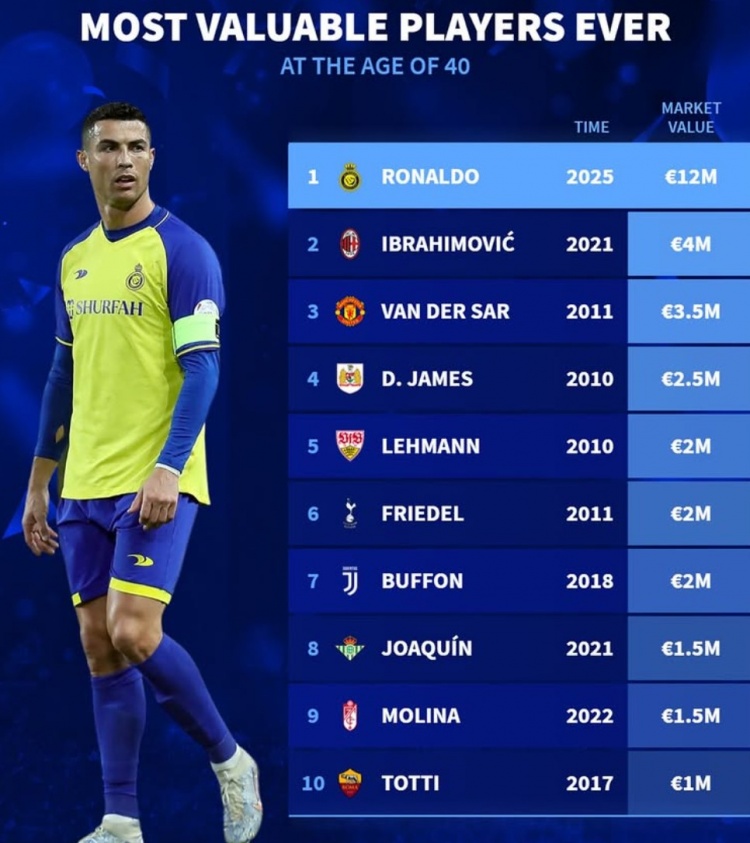 40歲身價最貴榜:C羅1200萬歐第1,伊布、范德薩、布馮、托蒂在列