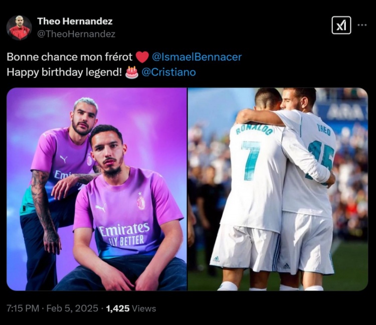 2月5日訊 今天是C羅40歲的生日,特奧也向他送上了生日祝福,同時還告別了離開米蘭加盟馬賽的本納塞爾。