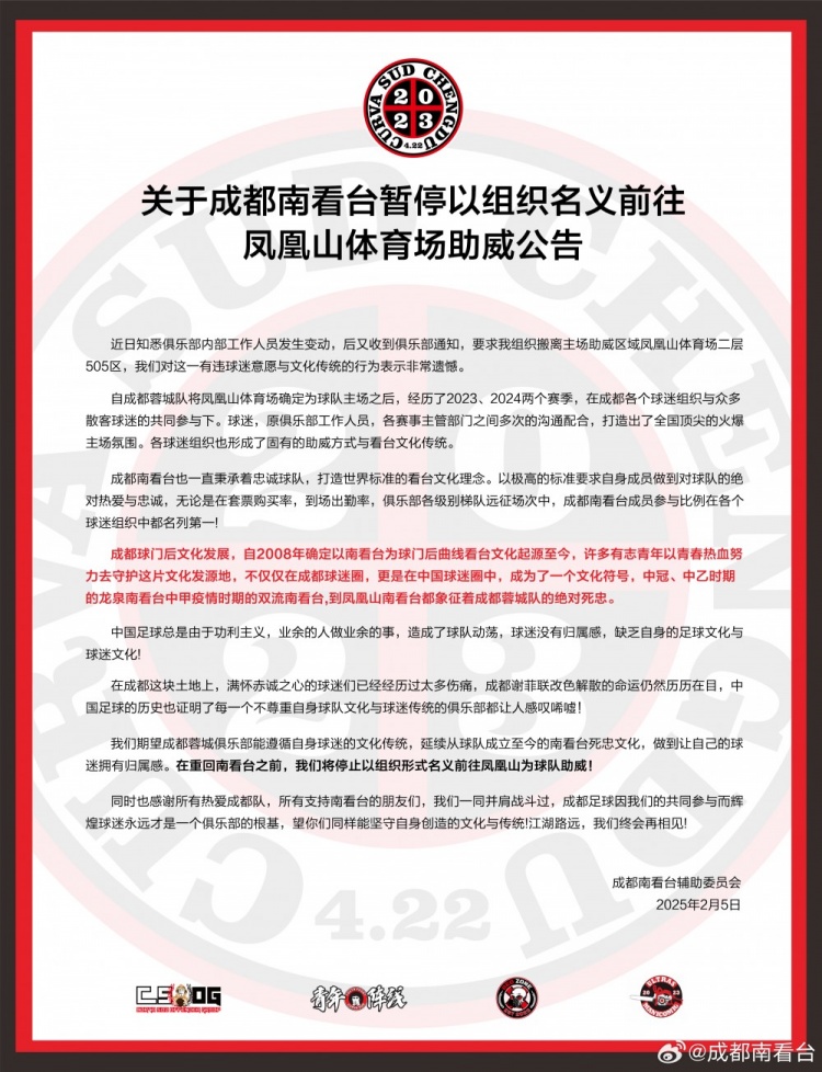 我們期望成都蓉城俱樂部能遵循自身球迷的文化傳統(tǒng),延續(xù)從球隊成立至今的南看臺死忠文化,做到讓自己的球迷擁有歸屬感。在重回南看臺之前,我們將停止以組織形式名義前往鳳凰山為球隊助威!