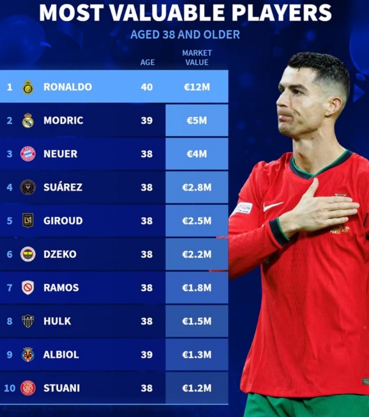 2月6日訊 《轉會市場》統(tǒng)計了38歲及以上球員身價榜,40歲的C羅居首。
