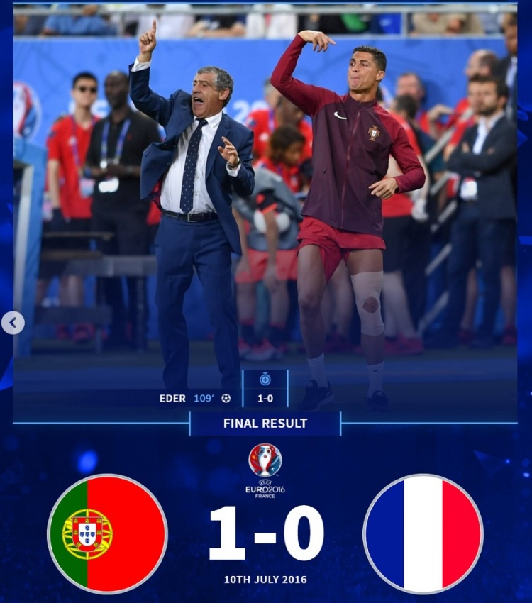 2016年歐洲杯決賽葡萄牙1-0法國(guó):幾乎一己之力扛著葡萄牙闖進(jìn)決賽的C羅傷退,他在場(chǎng)邊指揮比賽的場(chǎng)面也成為經(jīng)典,最終替補(bǔ)神兵埃德一劍封喉,幫助葡萄牙奪得隊(duì)史歐洲杯首冠。