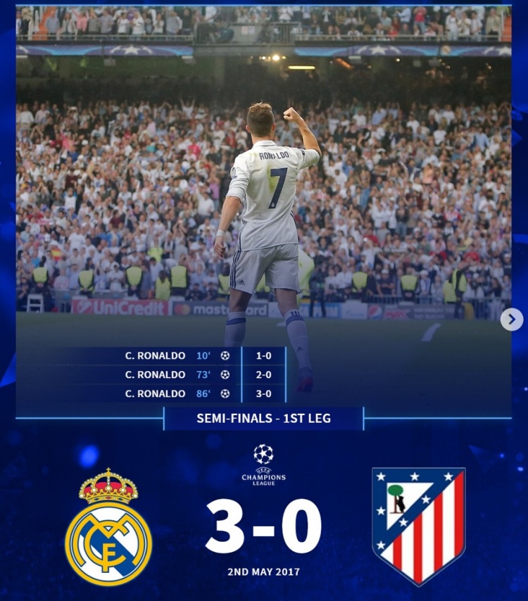 2017年5月歐冠半決賽首回合,皇馬主場(chǎng)3-0馬競(jìng):C羅上演帽子戲法,幫助皇馬確立大幅領(lǐng)先優(yōu)勢(shì)。
