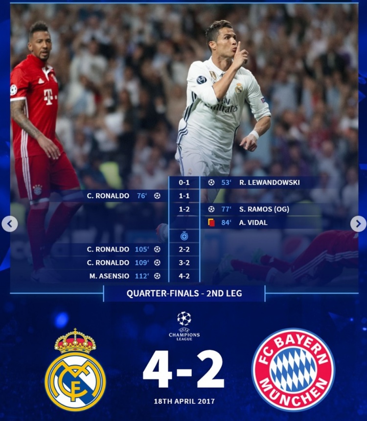 2017年4月歐冠八強(qiáng)戰(zhàn)次回合,皇馬主場(chǎng)4-2拜仁:C羅上演帽子戲法,幫助皇馬淘汰拜仁。
