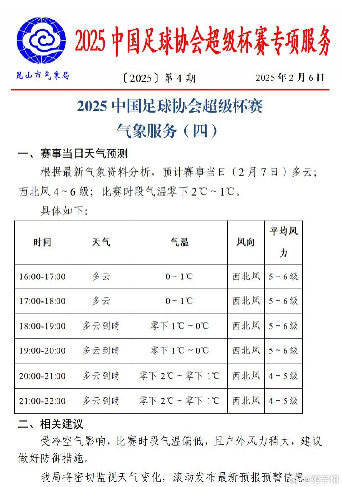 根據(jù)天氣預(yù)報(bào)的情況,預(yù)計(jì)賽事當(dāng)天昆山為多云天氣,西北風(fēng)4-6級(jí),比賽時(shí)段氣溫零下2度-零下1度。