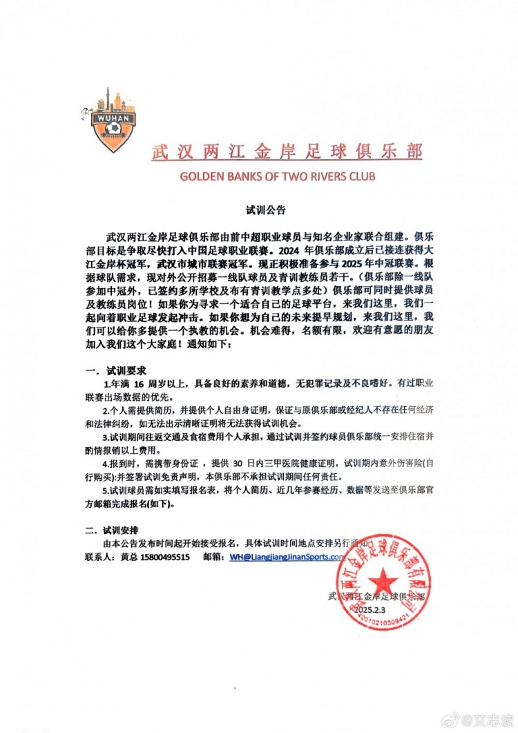 2月6日訊 近日,武漢兩江金岸足球俱樂部官方發(fā)布試訓(xùn)公告。