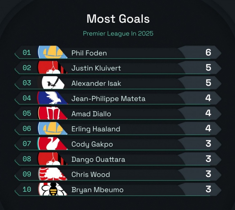 今年英超進(jìn)球榜:福登6球居首,伊薩克5球第2,阿瑪?shù)?、魔人等?