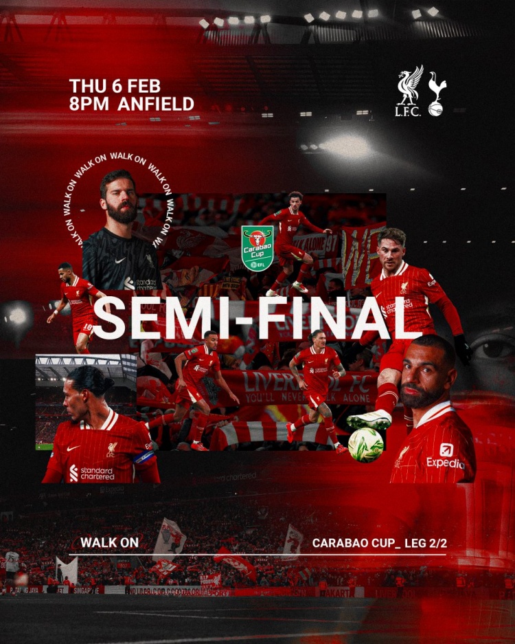 利物浦社媒發(fā)布為此役制作的海報并配文:聯(lián)賽杯半決賽將在安菲爾德進行。