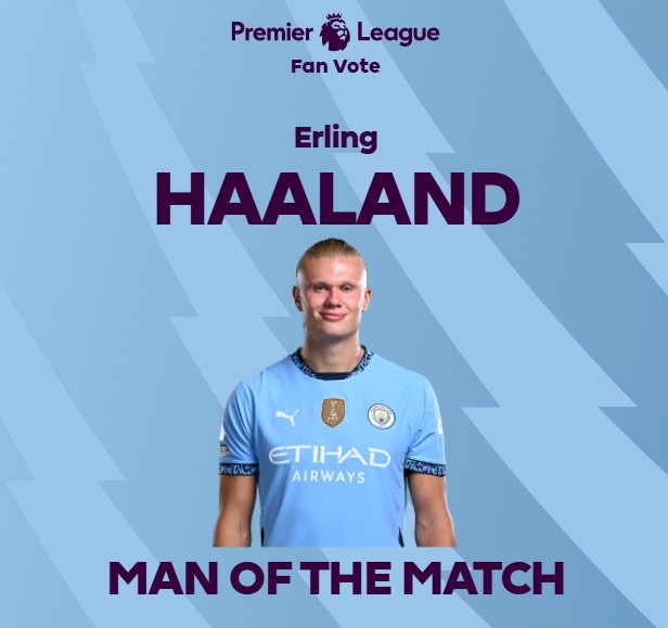1月26日訊 英超第23輪,曼城3-1切爾西。賽后,英超官方宣布,哈蘭德當(dāng)選全場最佳球員。