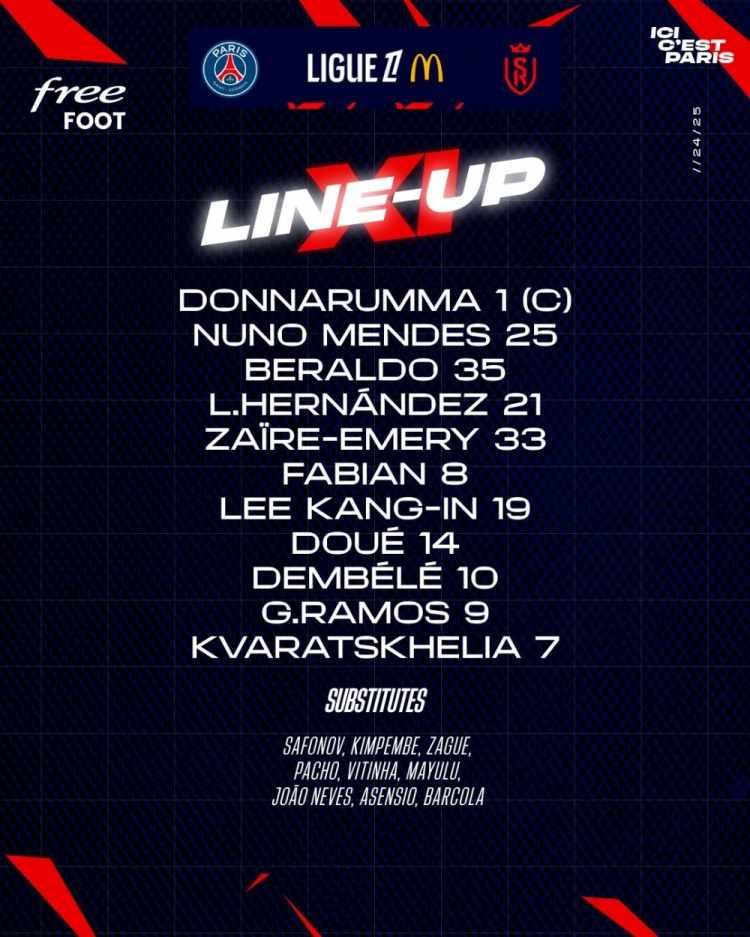 1-多納魯馬,25-努諾-門德斯,35-貝拉爾多,21-盧卡斯-埃爾南德斯,33-小埃梅里,8-法比安-魯伊斯,19-李剛仁,14-杜埃,10-登貝萊,9-貢薩洛-拉莫斯,7-克瓦拉茨赫利亞