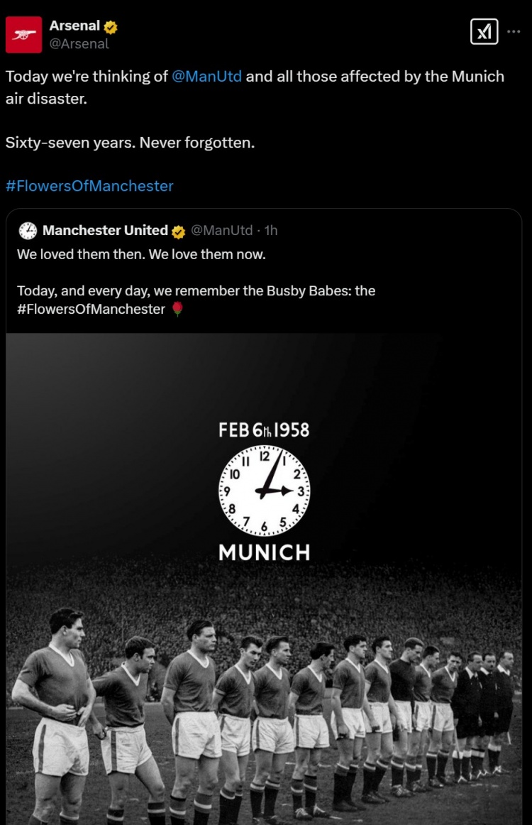 阿森納寫道:今天,我們向曼聯(lián)和所有受到慕尼黑空難影響的人們致以哀思。六十七年過去了,我們永遠不會忘記。