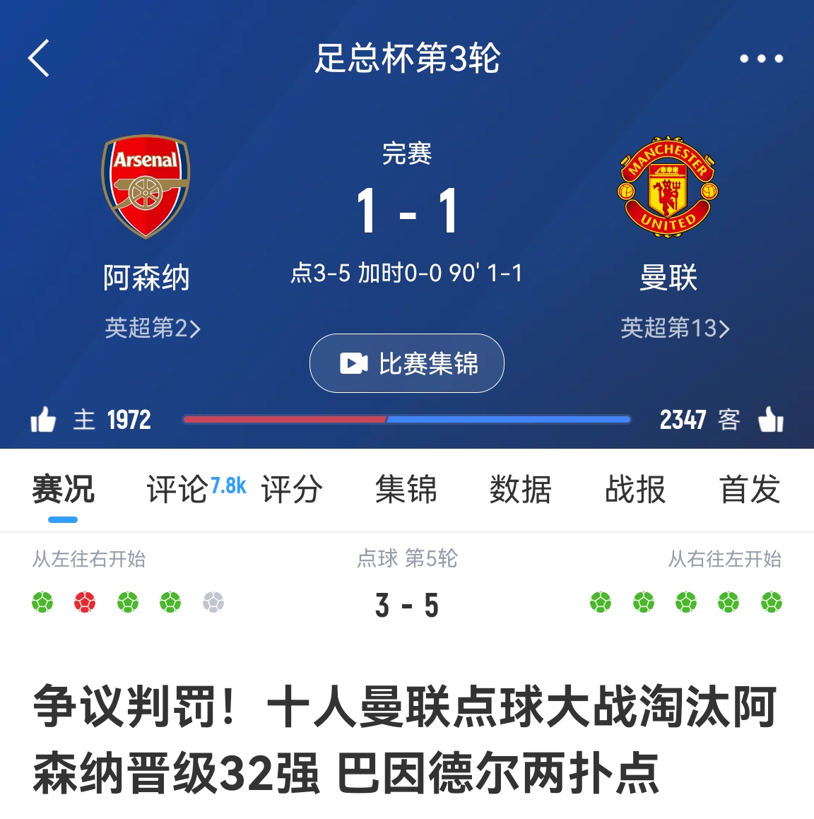 足總杯,1/32決賽點球3-5總分4-6不敵曼聯(lián)