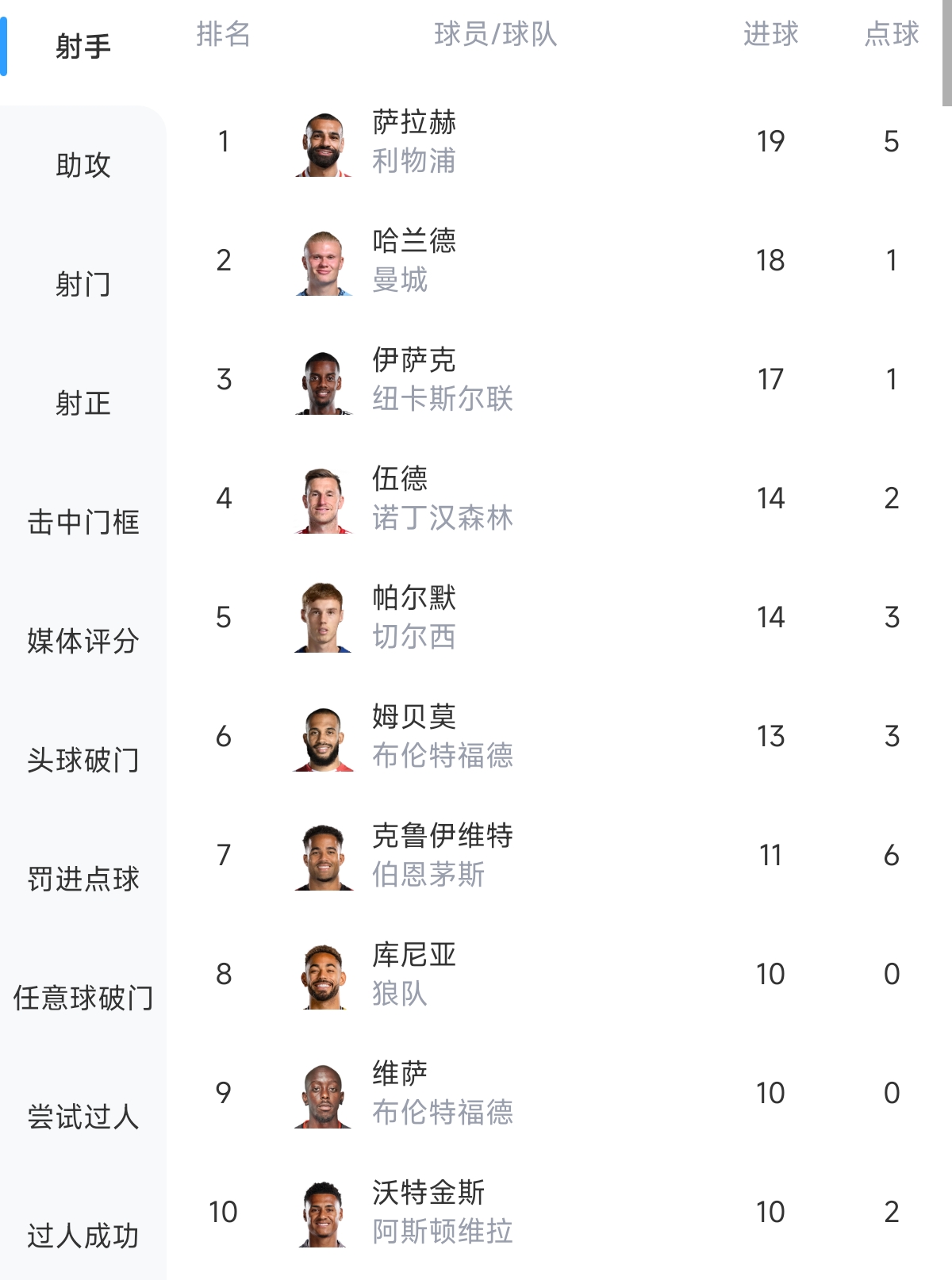 - 英超射手榜:薩拉赫19球領(lǐng)跑 哈蘭德18球第二、伊薩克17球第三