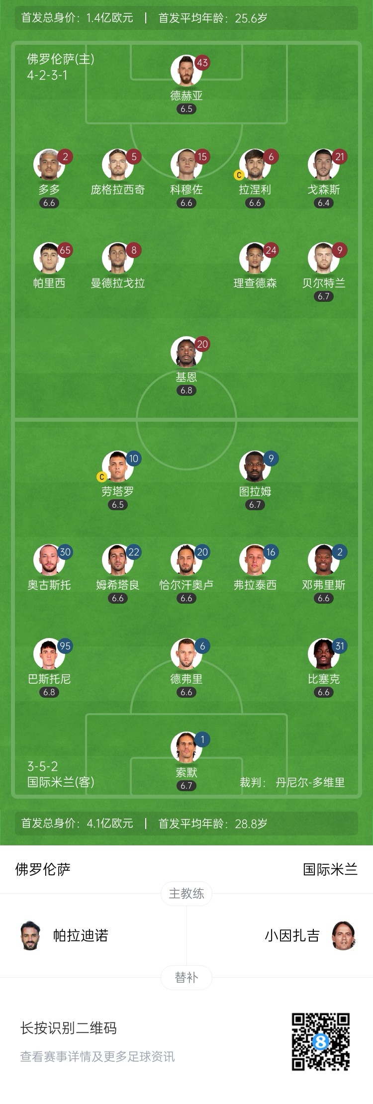 佛羅倫薩首發(fā):43-德赫亞、15-科穆佐、5-龐格拉契奇、6-盧卡-拉涅利、21-戈森斯、2-多多、8-曼德拉格拉、24-邁克爾-理查森、65-帕里西、9-貝爾特蘭、20-基恩