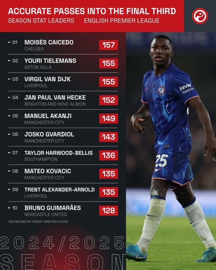 英超傳球到進攻三區(qū)榜:凱塞多壓范迪克居首,曼城3將在列