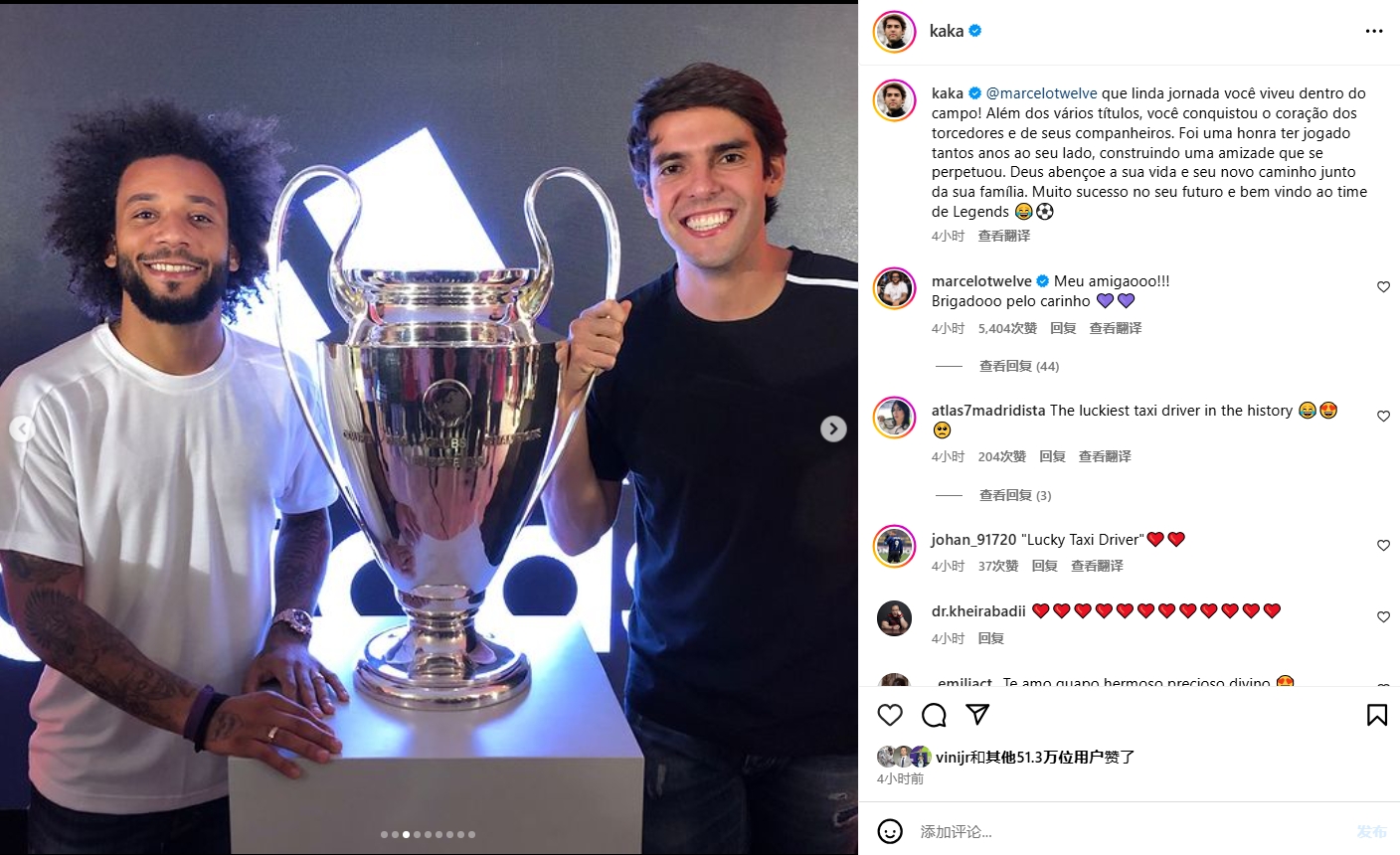 卡卡社媒曬出與馬塞洛的合照,并寫道:“馬塞洛,你在球場上的旅程多么美好!除了許多冠軍,你還贏得了球迷和隊友的心?!?/p>