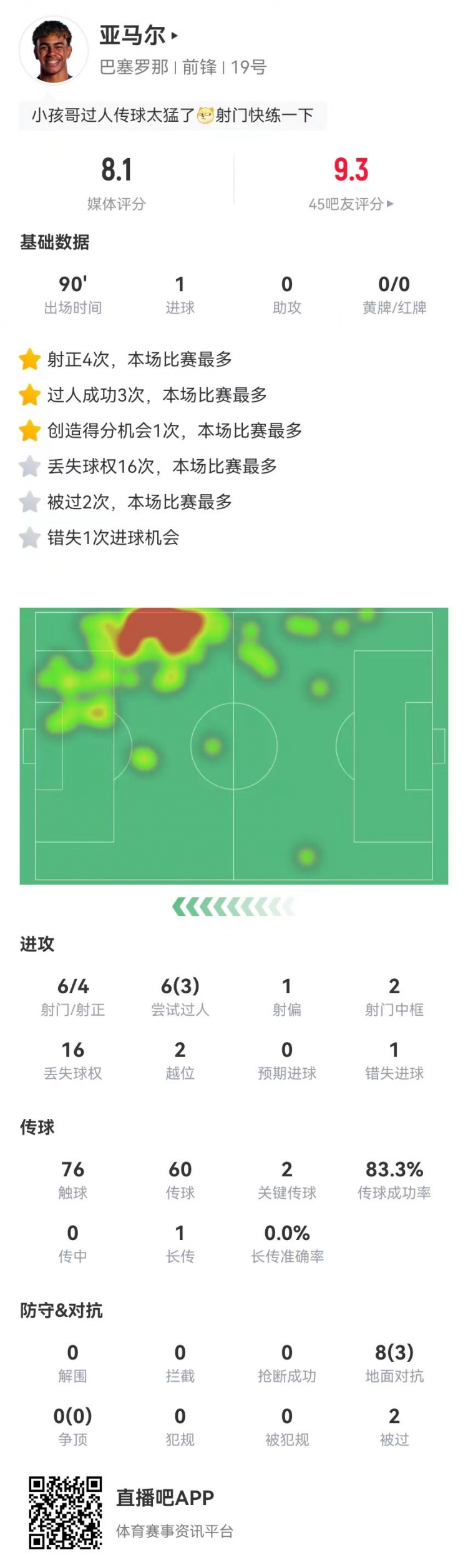 亞馬爾本場6射4正進(jìn)1球+2中框+1失良機(jī) 2關(guān)鍵傳球 獲評8.1分