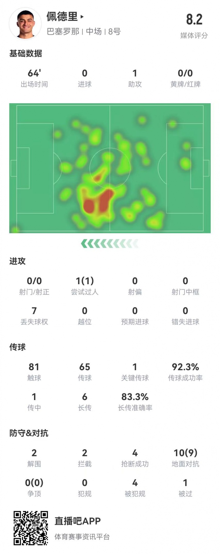 佩德里本場(chǎng)1助攻+5成功長(zhǎng)傳 10對(duì)抗9成功 4造犯規(guī)4搶斷 獲評(píng)8.2分