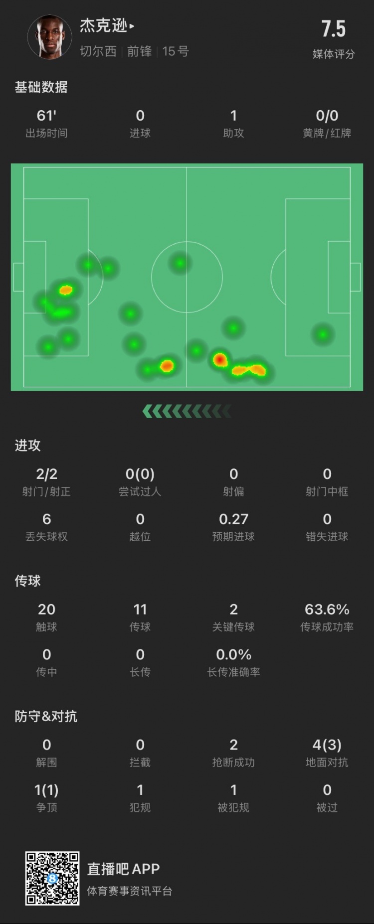 又香又臭?杰克遜本場:1次助攻,2射2正0進球,5次對抗成功4次