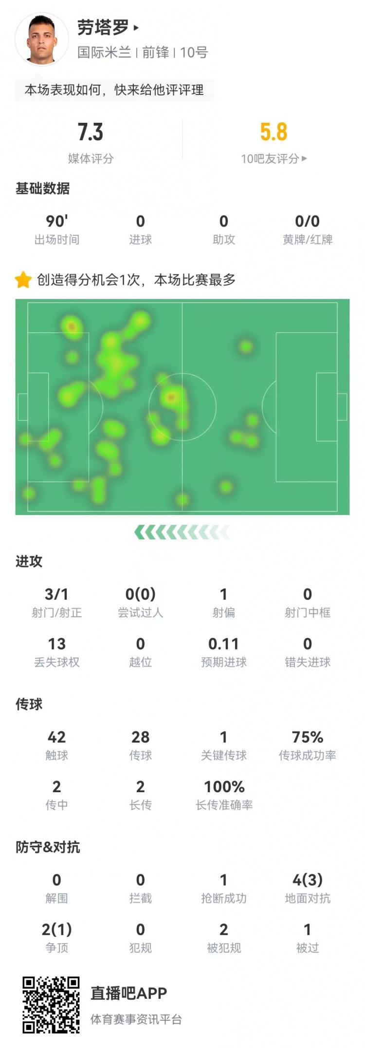 勞塔羅本場(chǎng)3射1正+1關(guān)鍵傳球 6對(duì)抗4成功+2造犯規(guī) 獲評(píng)7.3分