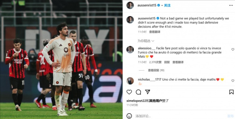 2月7日訊 不久前,羅馬后衛(wèi)胡梅爾斯更新了社交媒體,總結(jié)了球隊輸給米蘭的問題。