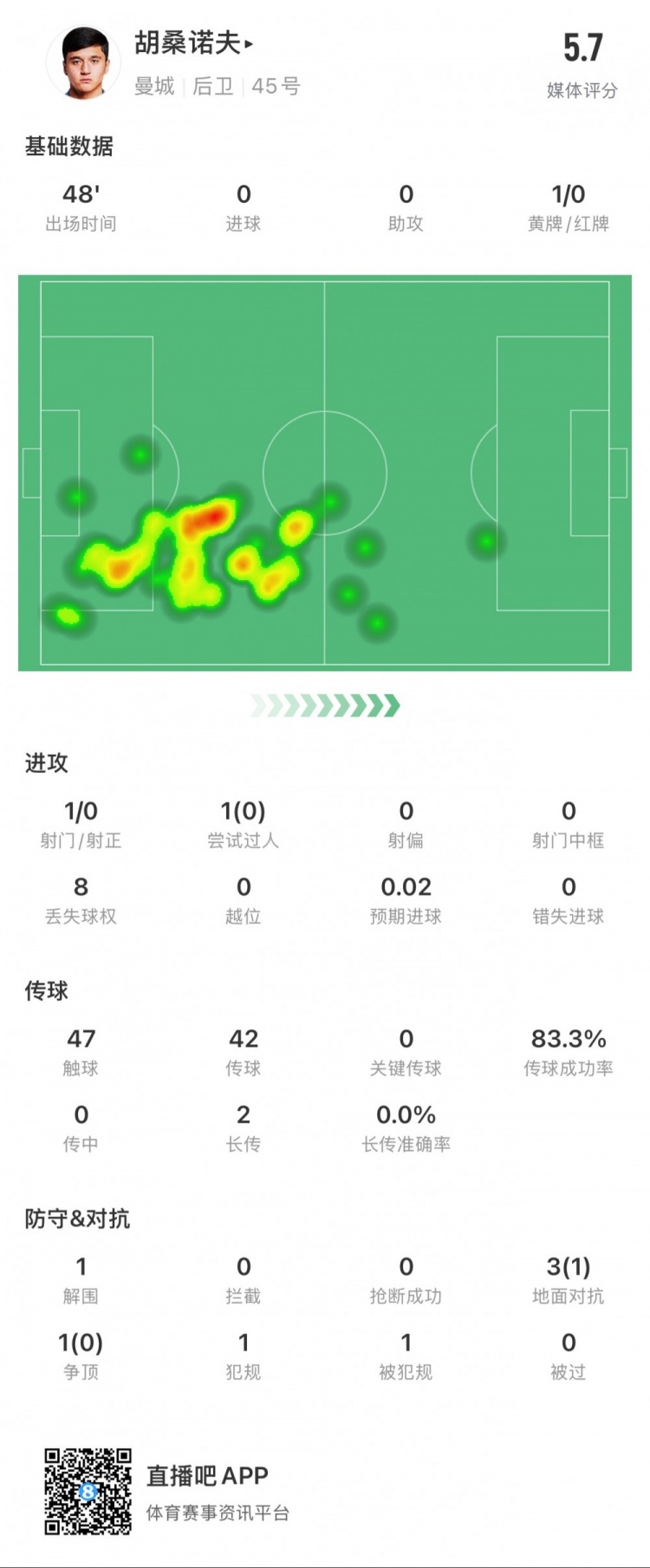 胡桑諾夫半場數(shù)據(jù):1次失誤導(dǎo)致丟球,1次解圍,4次對抗贏得1次