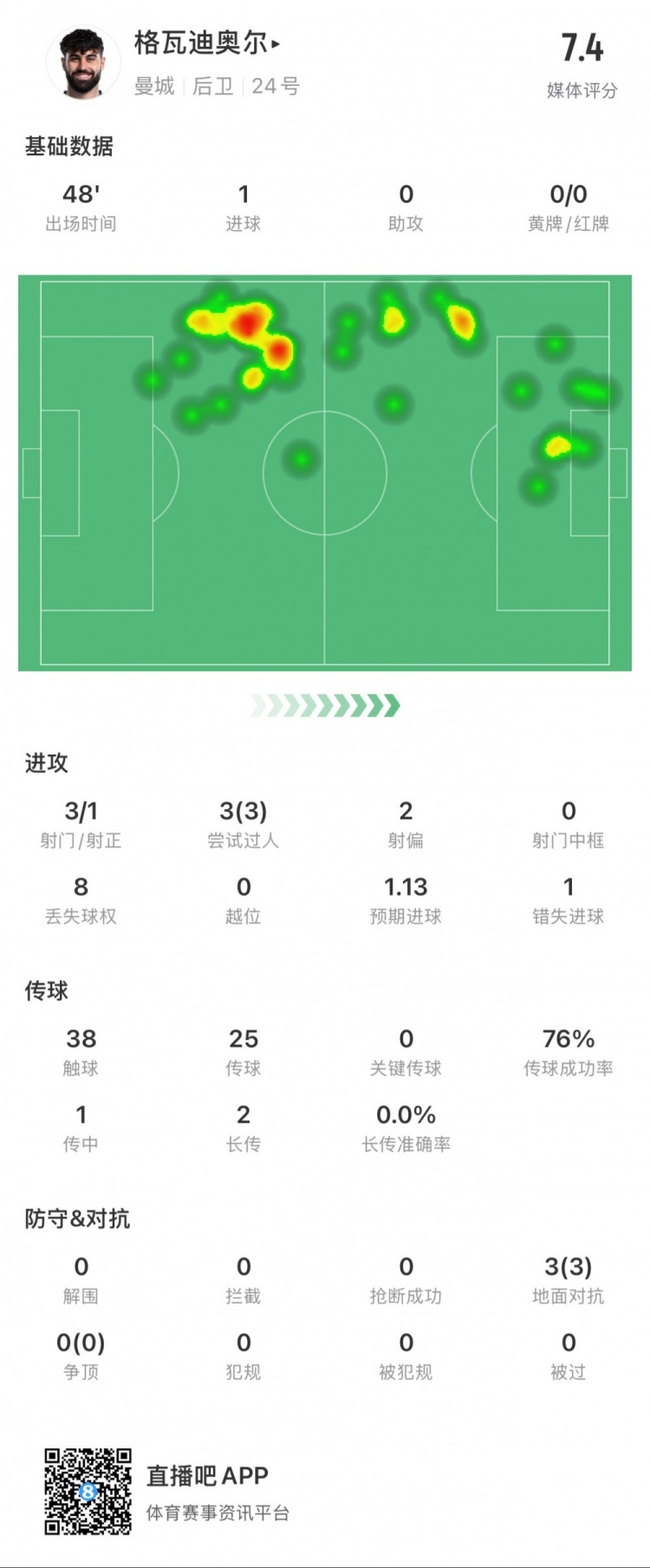 1月26日訊 本輪英超,半場曼城1-1切爾西。格瓦迪奧爾半場數(shù)據(jù):