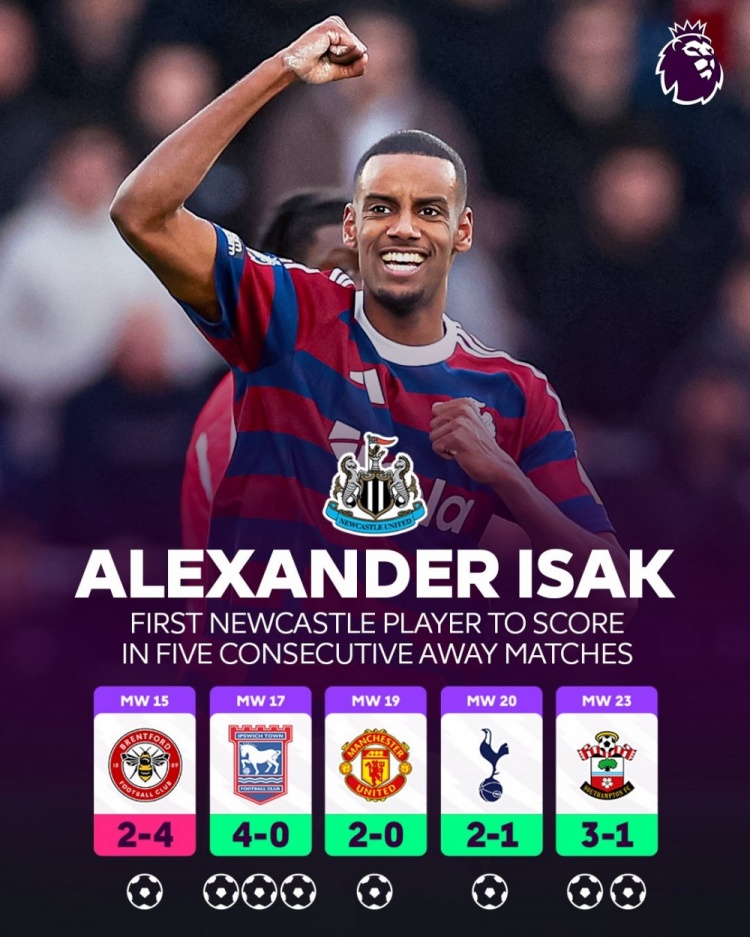 根據(jù)統(tǒng)計(jì),伊薩克成為了紐卡隊(duì)史上第一位連續(xù)5個(gè)英超客場(chǎng)比賽取得進(jìn)球的球員。