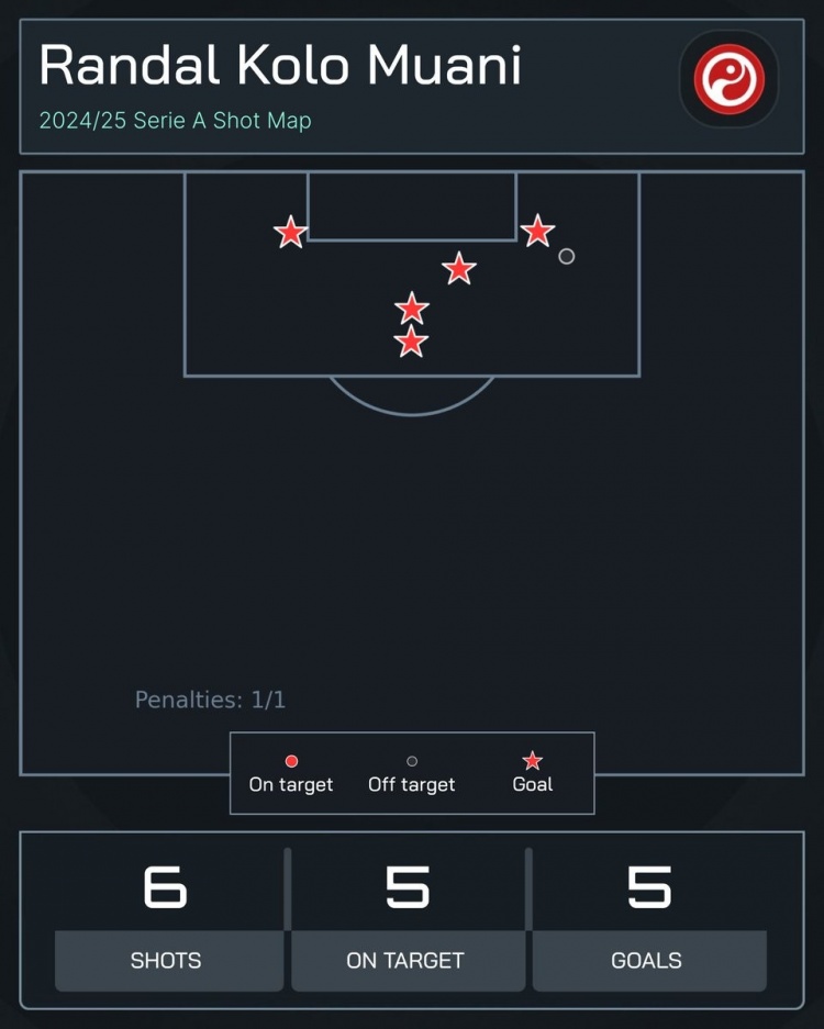 數(shù)據(jù)統(tǒng)計(jì)顯示,穆阿尼為尤文3場(chǎng)意甲打進(jìn)5球,共計(jì)僅射門(mén)6次且全部射正。